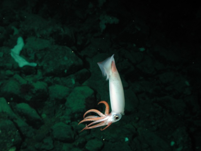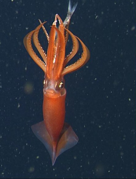 » 무인잠수정으로 1300m 심해에서 촬영한 고나투스 오닉스의 모습. 어릴 때는 바다 표면에 살다 성체가 되면 깊은 바다로 이동한다. NOAA/ MBARI
